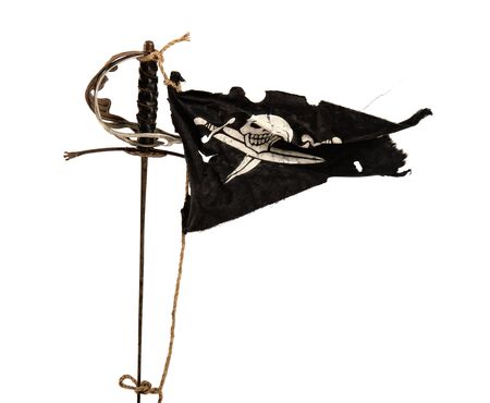 Black pirate flag winding up in the wind tied with a rope to an old sword
