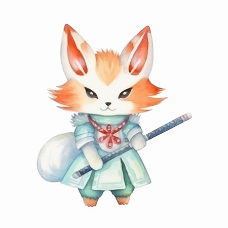Watercolor illustration of a cute fox in a kimono with a flute
