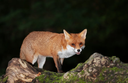 Portrait of a young red fox lying on a fallen tree in a dark forest at night, UK.