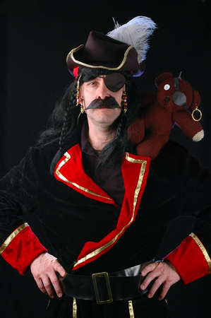 Actor in pirate custom with bear on shoulder over a dark background