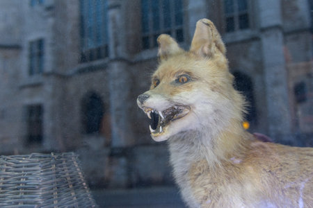 stuffed fox animal in the showcase city window with reflection of old european church