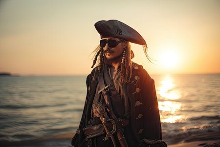 pirate, with eye patch and sword in hand, standing on beach before sunset, created with generative ai