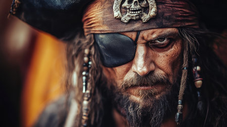 Portrait of a tough looking pirate wearing an eye patch and tricorn hat, posing against a dark background, conveying a sense of adventure and danger