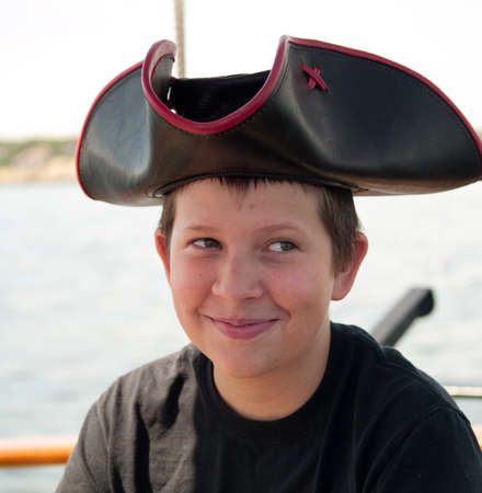 Pre-teen kid in a pirate hat on a boat