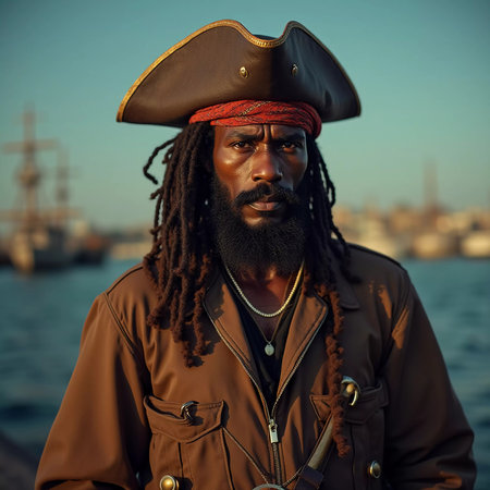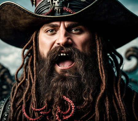 A seasoned pirate captain with long dreadlocks and a striking beard stares intently into the distance. Piracy is an activity committed by pirates, robbing ships on the seas, oceans. Generative AI.