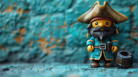 Cartoon pirate figure standing confidently against a teal background, playful and bold