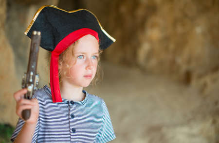 Little girl in pirate costume with musket gun near the cave entrance. Place for your text.
