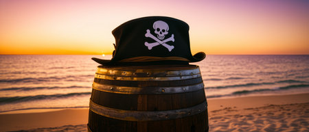 Pirate hat on barrel at beach sunset: adventure and mystery on the high seas.