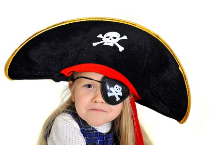 Cute little 5 years old blonde girl playing in pirate hat and eyepatch isolated on white background