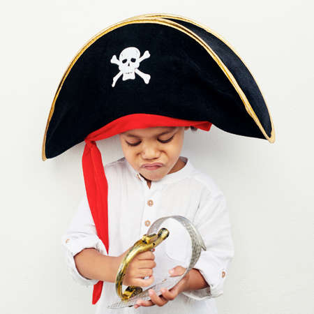 I thought they said this sword was real. a little boy wearing a pirate hat while holding a play sword against a white background.