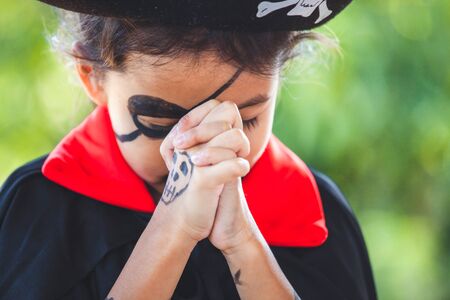 Cute asian child girl wearing halloween costumes and makeup making hands folded in prayer on Halloween celebration