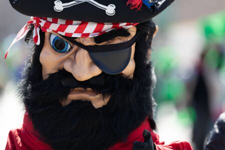 Chicago, Illinois, USA - March 16, 2019: St. Patrick's Day Parade, Man wearing a large pirate head during the parade