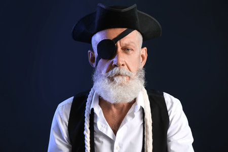 Old pirate on dark background, closeup