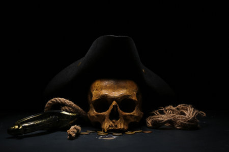 Human skull with sword, toy model of cannon, pirate hat and coins on black background