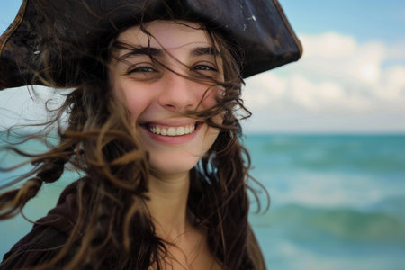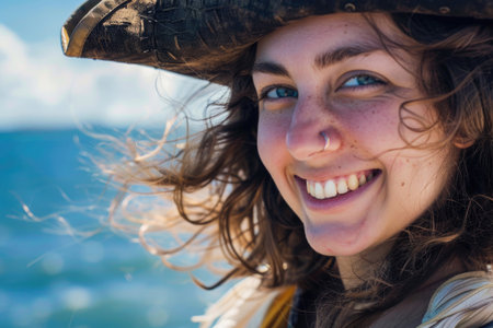 A young, smiling woman pirate in a hat, against an ocean backdrop, with windswept hair