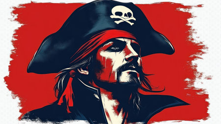 A confident pirate figure stands out against a vibrant red background, embodying adventure.