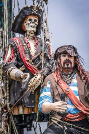 Penzance, England - May 2018 : Pirates figures on a pirate ship in the Penzance harbour, Cornwall, UK