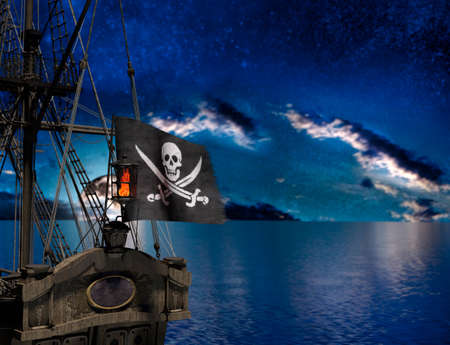 Black silhouette of the pirate ship in night. night scene of ghost pirate ship in the sea with mysterious light. Selective focus