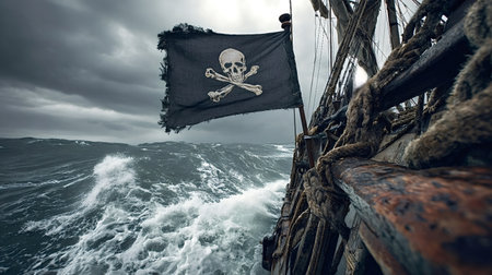 Pirate flag with skull and crossbones flies from a ship's mast as the vessel plows through a dark storm, crashing waves and a dramatic, foreboding sky ahead