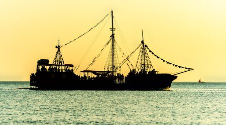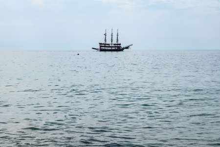 Side, Turkey, August 2018: Pirate ship in the mediterranean sea. Evening landscape with a ship at sunset