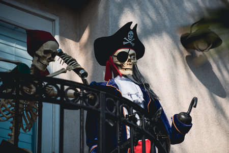 Skeletons of pirates. Scenery for Halloween in October. Decoration in the yard.