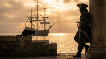 A silhouetted pirate with his sword and a black cat stands on a stone pier, gazing at a historic sailing ship anchored in the bay during a golden sunset.