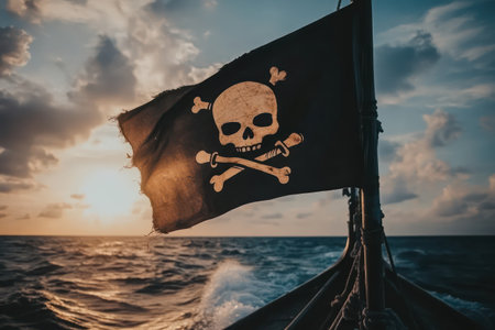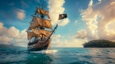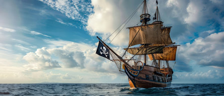 A pirate flag flutters on a tall ship with billowing sails above the ocean, evoking freedom, adventure, and maritime lore.
