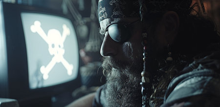 A close-up shot of a man with an eyepatch and a long beard, watching a television screen displaying a skull and crossbones symbol.