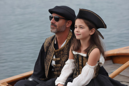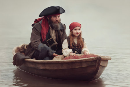 Father and daughter dressed in pirate costumes, sailing together on a wooden boat across a serene lake, enjoying a playful adventure