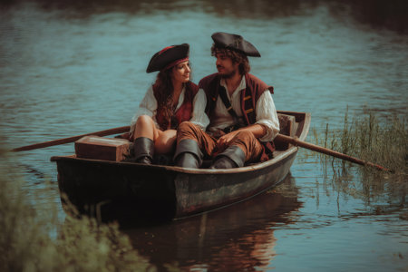 Romantic couple dressed as pirates, rowing a small boat on a serene river, discovering adventure while surrounded by a treasure chest