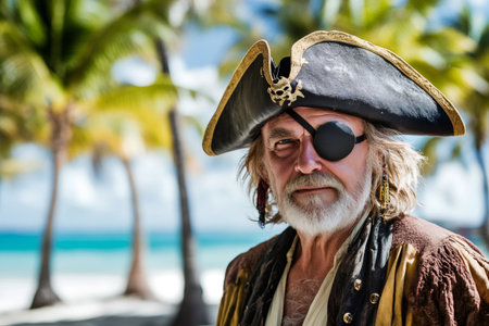 Senior male actor portraying famous historical figure of buccaneer, wearing eye patch, tricorn hat and posing on tropical beach