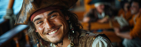 Caucasian man in pirate costume smiling and laughing in pirate ship.
