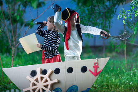 A merry band of pirates, a group photo in carnival costumes, corsairs on the background of sails
