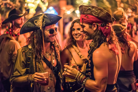 Costume party, drinks and dance, Pirate Party: Eye patches, tricorn hats, and pirate garb, friends engaging in swashbuckling fun.