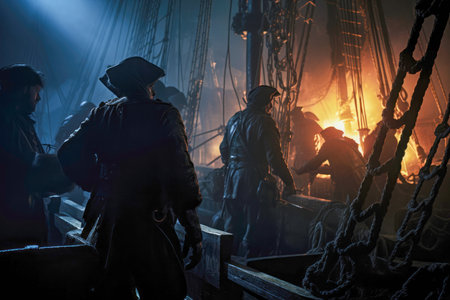 Pirates stealthily board an enemy ship under the cover of night, seeking adventure and treasure amidst danger