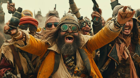 Conceptual image of a group of post-apocalyptic friends in steampunk outfits, laughing together, showcasing camaraderie and joy Generative AI