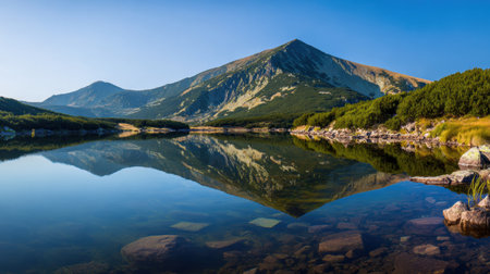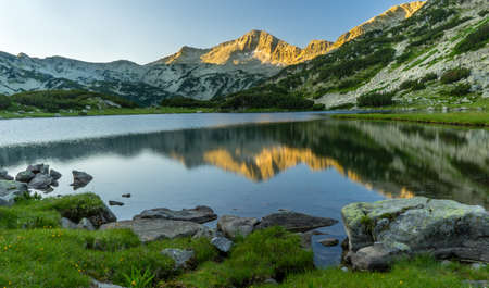 Kamenitsa peak and its reflection in a lake in Pirin National Park, Bulgaria, Europe