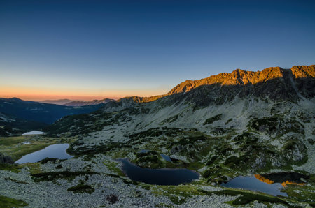 Mountain landscape and glacial lakes at sunrise in Retezat National Park, Carpathian Mountains, Romania