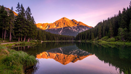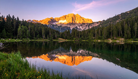 A gilded mountain peak reflects in the waters of a crystal clear lake