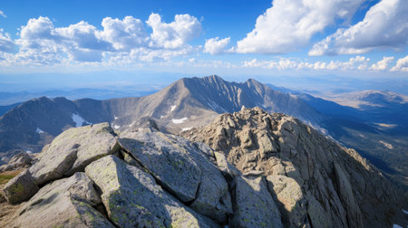 Rocky mountain summit with a vast sky backdrop, excellent for copy space.