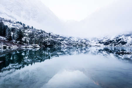 Reflection of peaks in mountain lake. Snowy winter in mountain valley