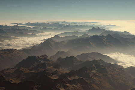 An aerial perspective showcases a vast mountain range, partially obscured by cloud cover. The image displays a gradient of colors from blues to browns, with textures of rocky peaks and swirling clouds. The overall composition suggests a sense of depth. This image can be suitable for a variety of commercial and editorial applications.