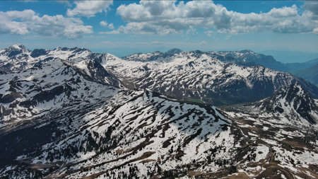 Aerial view of amazing rocky mountains in snow, Prokletie, Montenegro