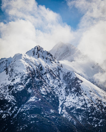 A stunning snow-covered mountain range showcases the beauty of winter with dramatic clouds overhead and rugged terrain, inviting adventure and exploration in nature's embrace.