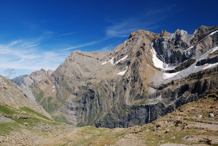 The cirque of Gavarnie is a large rock amphitheater in French Pyrenees. The cirque's walls are twisted and layered. The cirque is bordered by several peaks of over 3000m.