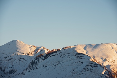 Beautiful sunset view on the high winter mountains peaks, on the sky background. Mountain ice paradise landscape, sunrise light.