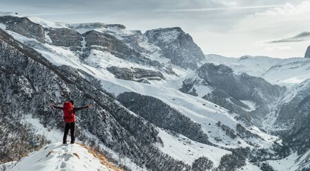 Clouds and fog cover the snowy mountain top and gorge. The beauty of nature. Photo for desktop wallpaper