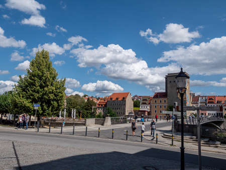 Gorlitz, Germany - June 2, 2021: Lusatian Neisse river with waterfall on the border between Poland and Germany at Gorlitz and Zgorzelec.