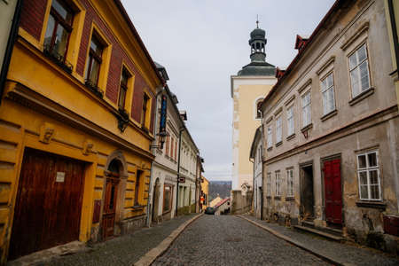 Narrow medieval picturesque street with baroque and renaissance historical buildings in winter day, bell tower of church of St. Nicholas, Bohemian Paradise, Turnov, Czech Republic, January 01, 2021
