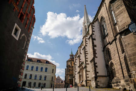Goerlitz, Germany, 04 September 2021: gothic medieval St. Peter and Paul Church or Peterskirche with two white towers in historical center of city near river at sunny summer day, arched portal.